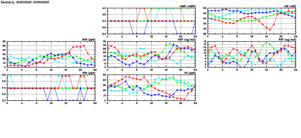 | Air Quality Data Time Series in Eastern (2020/05/22) | ( Line colors: Day -3 Day -2 Day -1 Current day ) | 2D Map Current AQHI |
