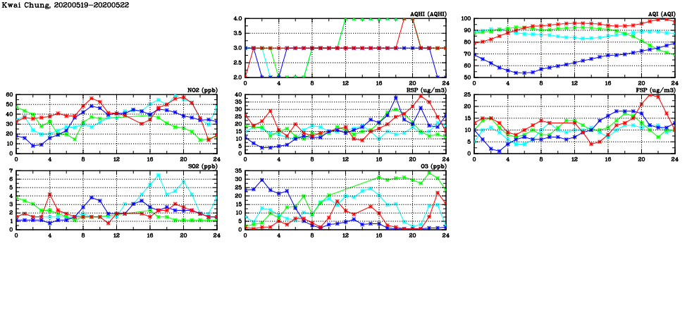 | Air Quality Data Time Series in Kwai Chung (2020/05/22) | ( Line colors: Day -3 Day -2 Day -1 Current day ) | 2D Map Current AQHI |