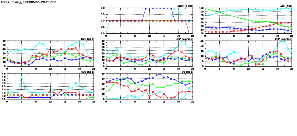 | Air Quality Data Time Series in Kwai Chung (2020/05/25) | ( Line colors: Day -3 Day -2 Day -1 Current day ) | 2D Map Current AQHI |
