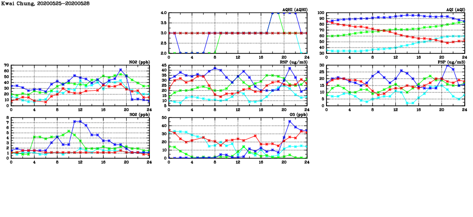 | Air Quality Data Time Series in Kwai Chung (2020/05/28) | ( Line colors: Day -3 Day -2 Day -1 Current day ) | 2D Map Current AQHI |