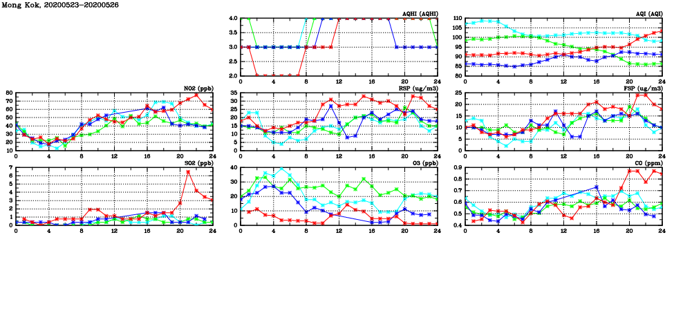 | Air Quality Data Time Series in Mong Kok (2020/05/26) | ( Line colors: Day -3 Day -2 Day -1 Current day ) | 2D Map Current AQHI |
