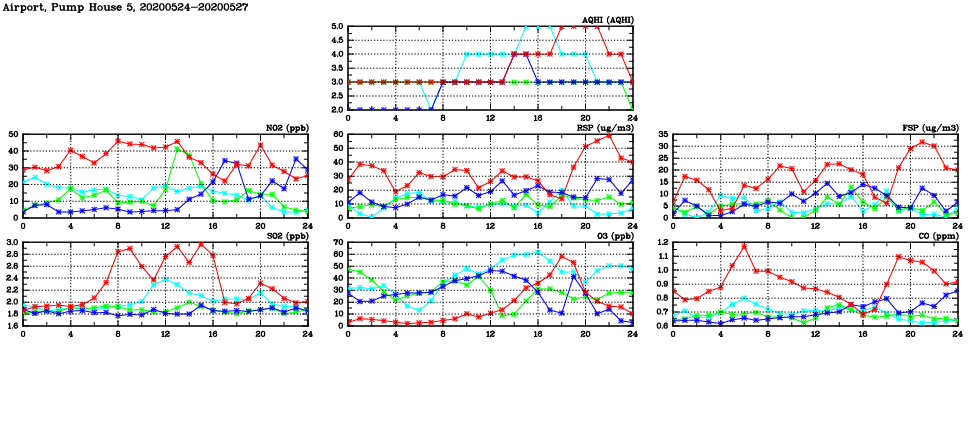 | Air Quality Data Time Series in Airport, Pump House 5 (2020/05/27) | ( Line colors: Day -3 Day -2 Day -1 Current day ) | 2D Map Current AQHI |