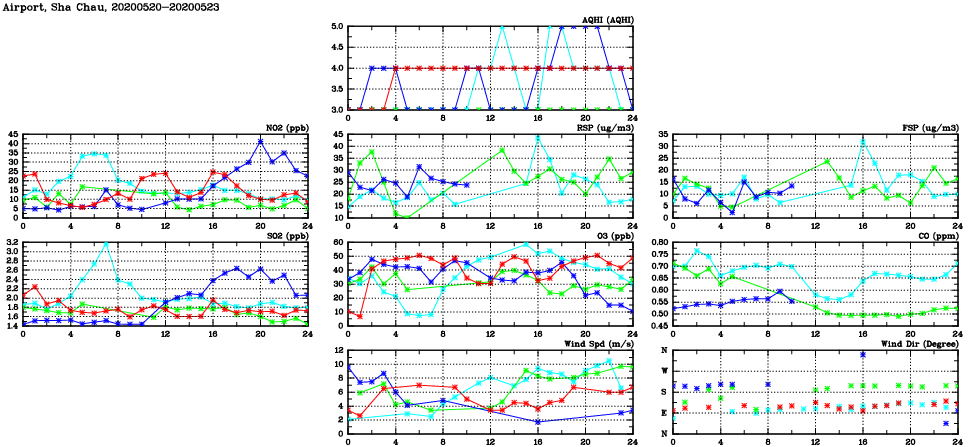 | Air Quality Data Time Series in Airport, Sha Chau (2020/05/23) | ( Line colors: Day -3 Day -2 Day -1 Current day ) | 2D Map Current AQHI |