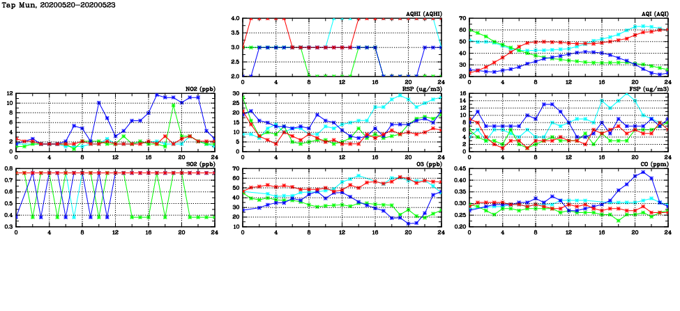 | Air Quality Data Time Series in Tap Mun (2020/05/23) | ( Line colors: Day -3 Day -2 Day -1 Current day ) | 2D Map Current AQHI |