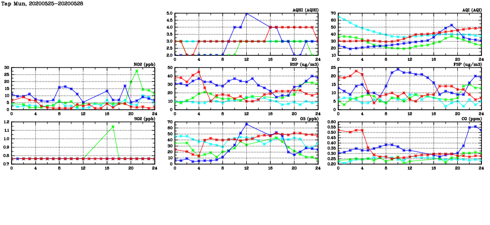 | Air Quality Data Time Series in Tap Mun (2020/05/28) | ( Line colors: Day -3 Day -2 Day -1 Current day ) | 2D Map Current AQHI |