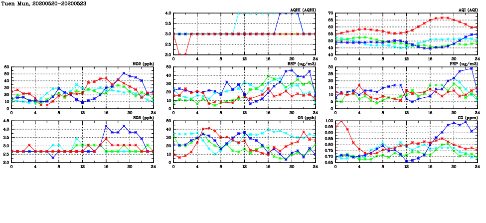 | Air Quality Data Time Series in Tuen Mun (2020/05/23) | ( Line colors: Day -3 Day -2 Day -1 Current day ) | 2D Map Current AQHI |