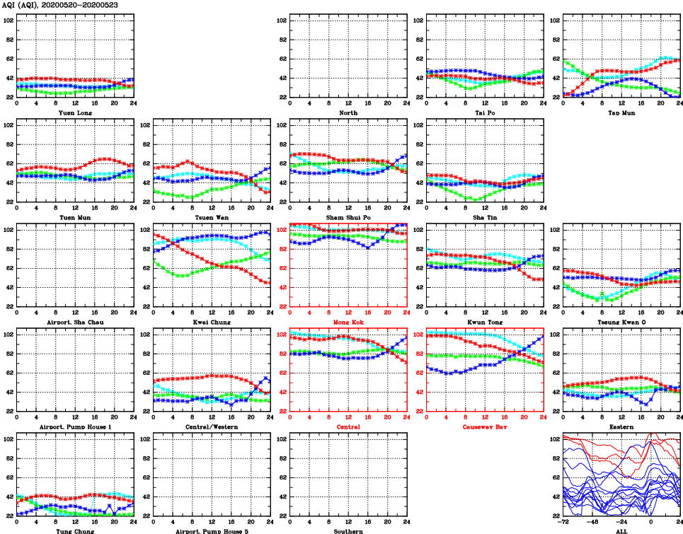 | Air Quality Data Time Series for AQI (2020/05/23) | ( Line colors: Day -3 Day -2 Day -1 Current day ) | 2D Map Current AQHI |