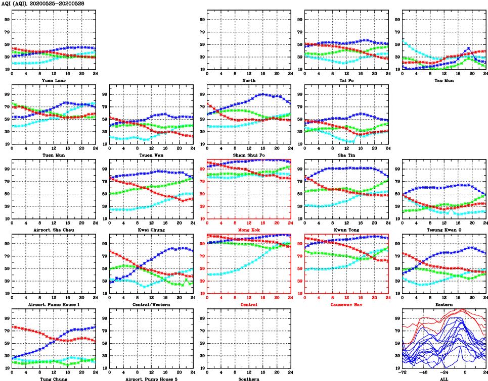 | Air Quality Data Time Series for AQI (2020/05/28) | ( Line colors: Day -3 Day -2 Day -1 Current day ) | 2D Map Current AQHI |