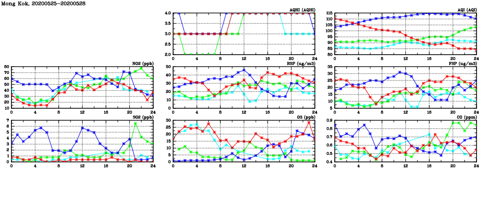 | Air Quality Data Time Series in Mong Kok (2020/05/28) | ( Line colors: Day -3 Day -2 Day -1 Current day ) | 2D Map Current AQHI |