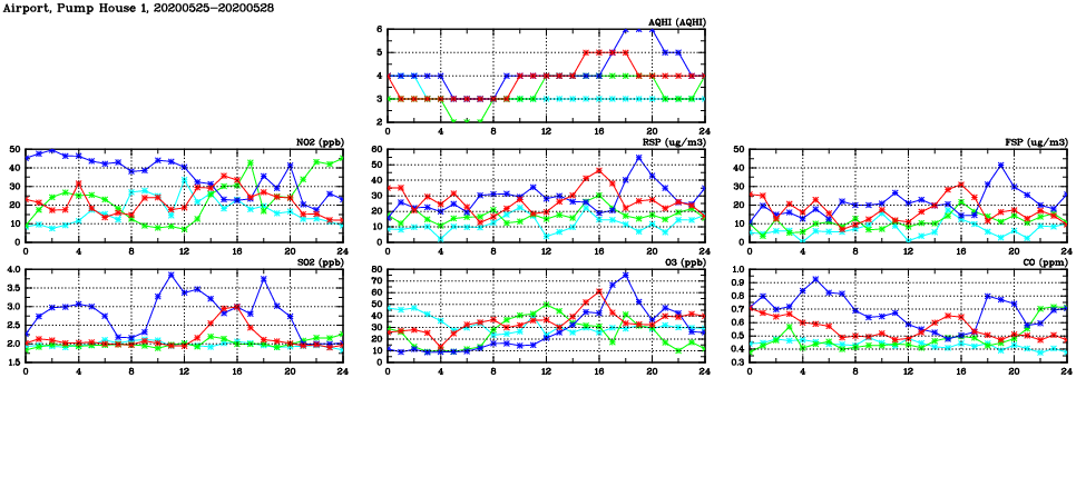 | Air Quality Data Time Series in Airport, Pump House 1 (2020/05/28) | ( Line colors: Day -3 Day -2 Day -1 Current day ) | 2D Map Current AQHI |