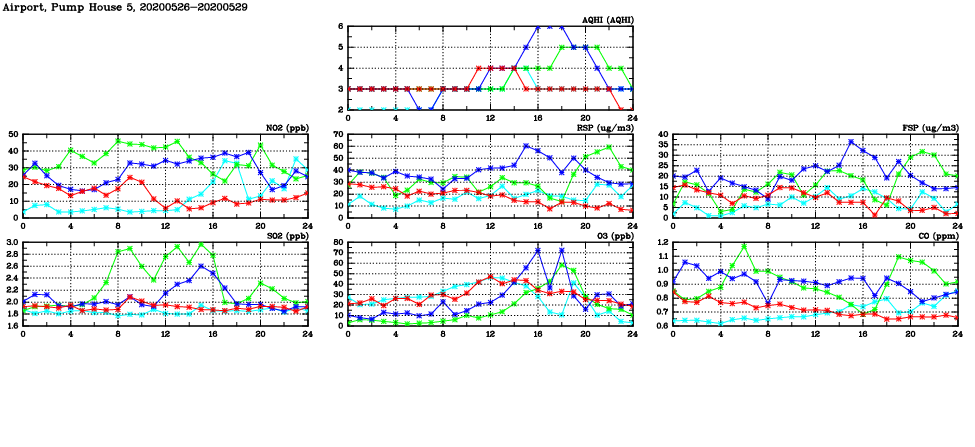 | Air Quality Data Time Series in Airport, Pump House 5 (2020/05/29) | ( Line colors: Day -3 Day -2 Day -1 Current day ) | 2D Map Current AQHI |
