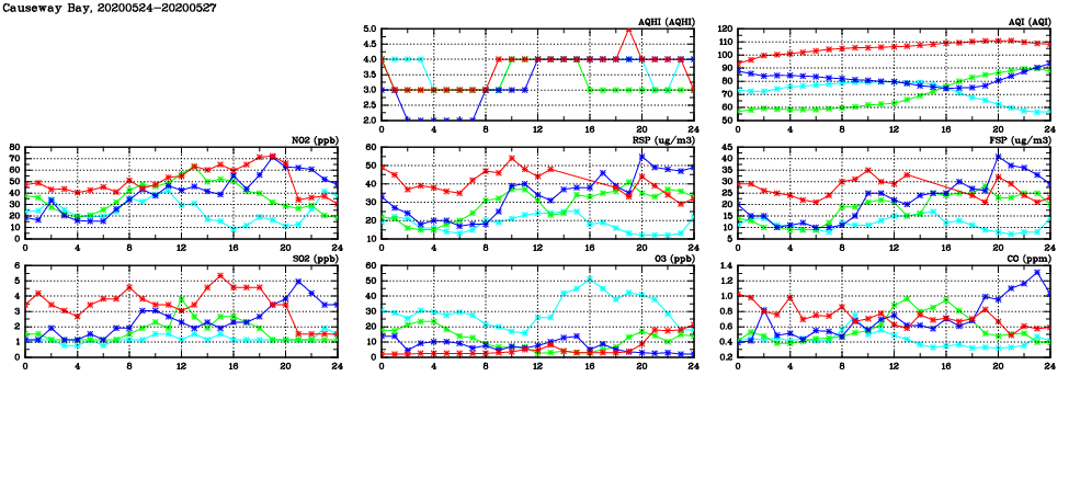 | Air Quality Data Time Series in Causeway Bay (2020/05/27) | ( Line colors: Day -3 Day -2 Day -1 Current day ) | 2D Map Current AQHI |