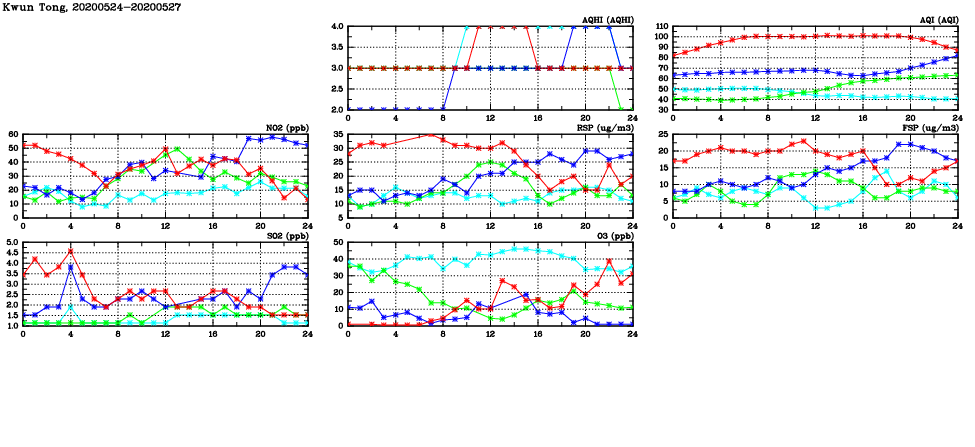 | Air Quality Data Time Series in Kwun Tong (2020/05/27) | ( Line colors: Day -3 Day -2 Day -1 Current day ) | 2D Map Current AQHI |