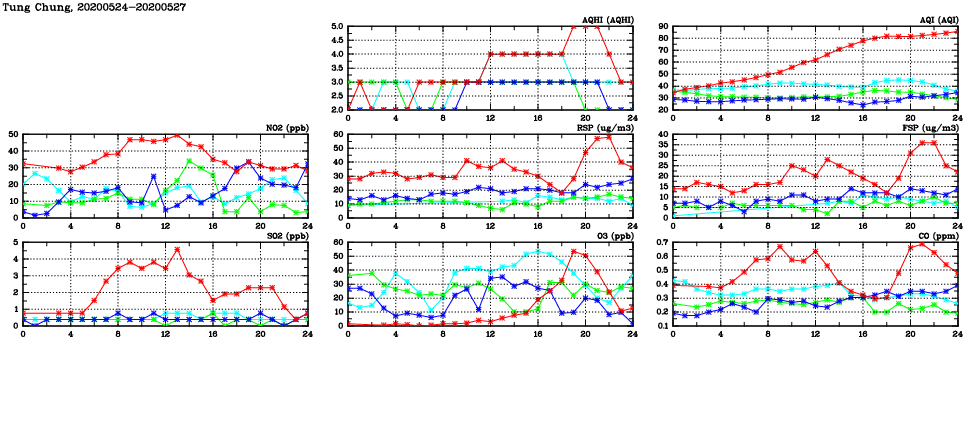 | Air Quality Data Time Series in Tung Chung (2020/05/27) | ( Line colors: Day -3 Day -2 Day -1 Current day ) | 2D Map Current AQHI |