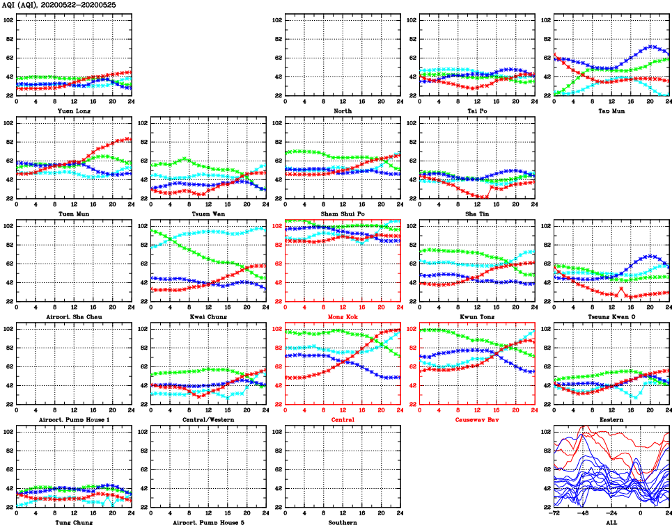 | Air Quality Data Time Series for AQI (2020/05/25) | ( Line colors: Day -3 Day -2 Day -1 Current day ) | 2D Map Current AQHI |