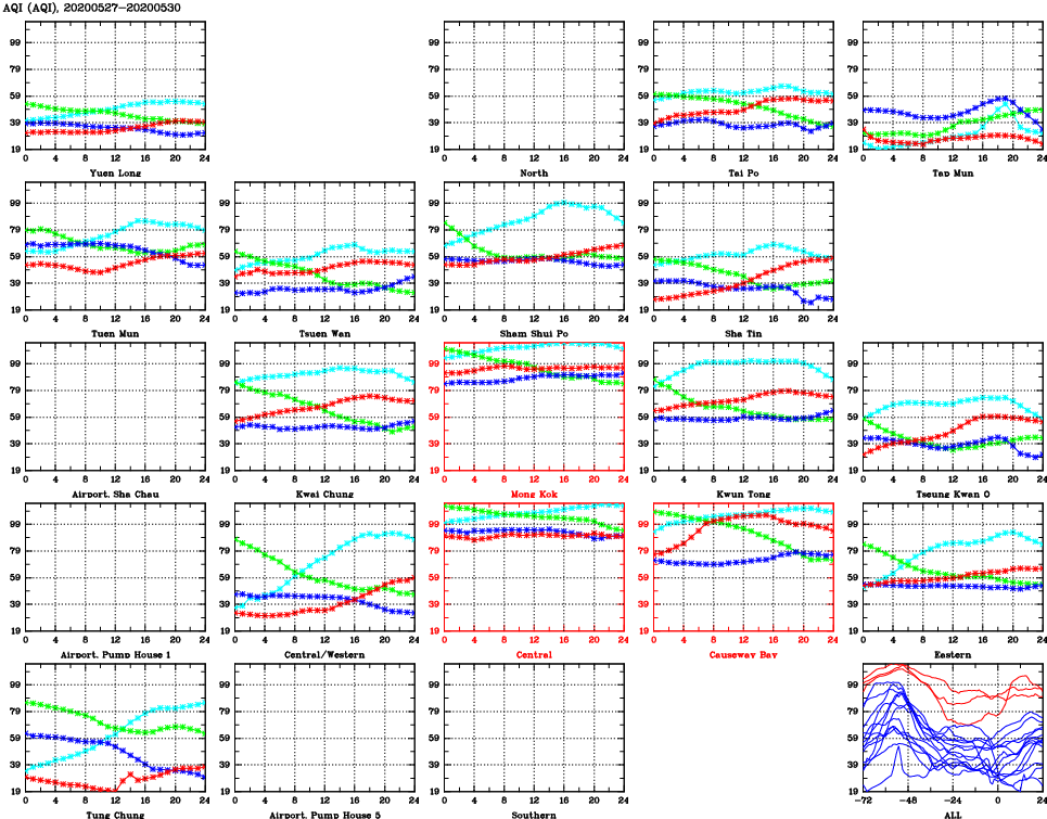 | Air Quality Data Time Series for AQI (2020/05/30) | ( Line colors: Day -3 Day -2 Day -1 Current day ) | 2D Map Current AQHI |