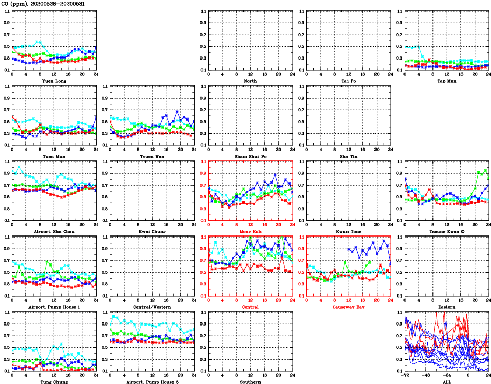 | Air Quality Data Time Series for CO (2020/05/31) | ( Line colors: Day -3 Day -2 Day -1 Current day ) | 2D Map Current AQHI |