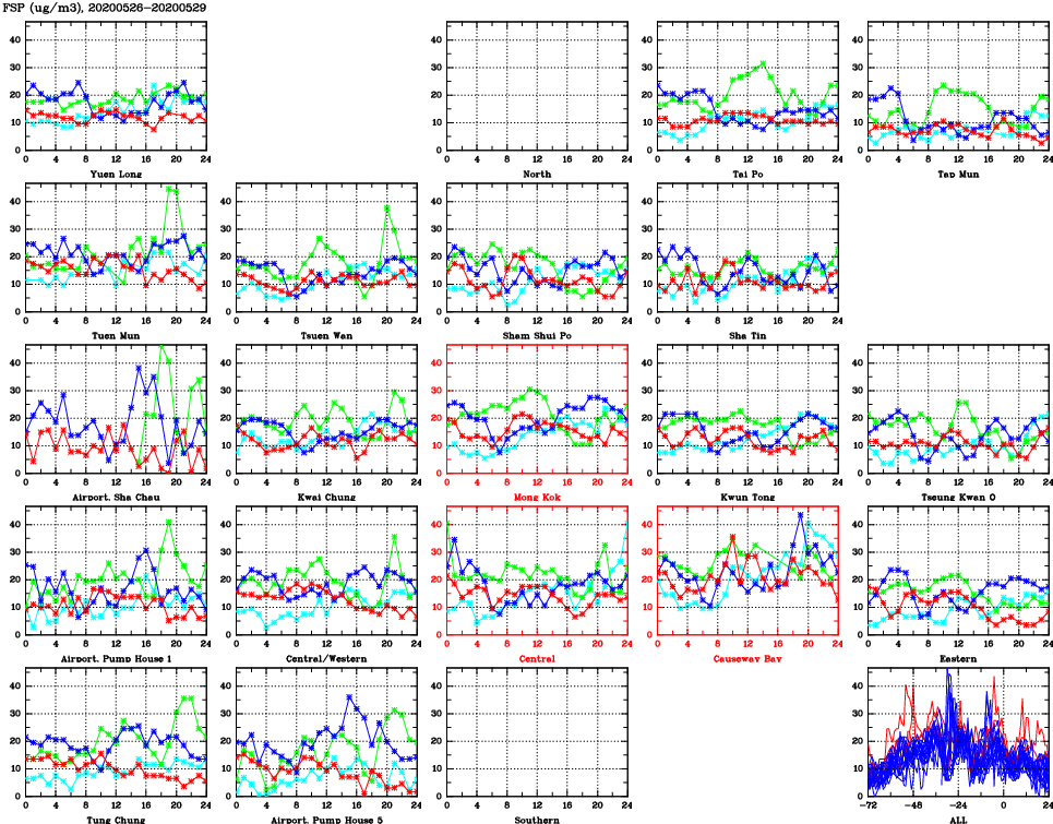| Air Quality Data Time Series for FSP (2020/05/29) | ( Line colors: Day -3 Day -2 Day -1 Current day ) | 2D Map Current AQHI |