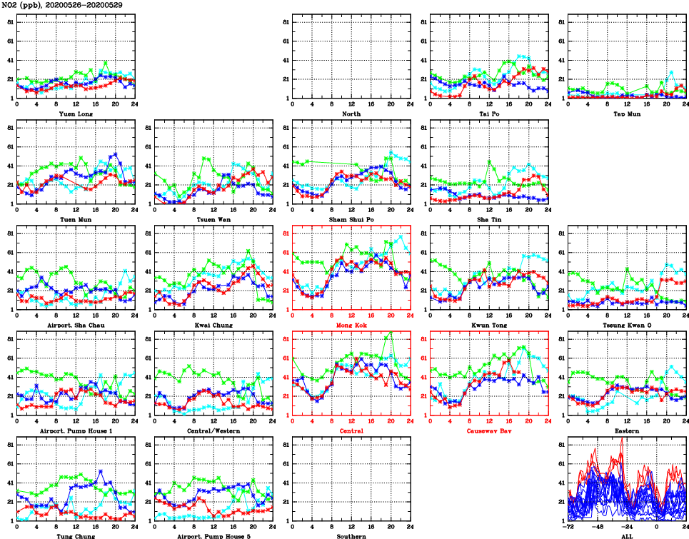 | Air Quality Data Time Series for NO2 (2020/05/29) | ( Line colors: Day -3 Day -2 Day -1 Current day ) | 2D Map Current AQHI |