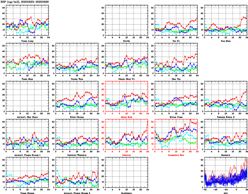 | Air Quality Data Time Series for RSP (2020/05/26) | ( Line colors: Day -3 Day -2 Day -1 Current day ) | 2D Map Current AQHI |