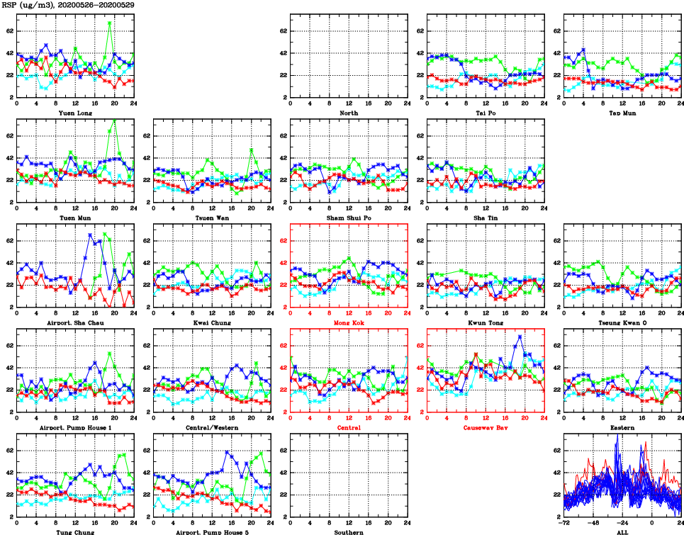 | Air Quality Data Time Series for RSP (2020/05/29) | ( Line colors: Day -3 Day -2 Day -1 Current day ) | 2D Map Current AQHI |