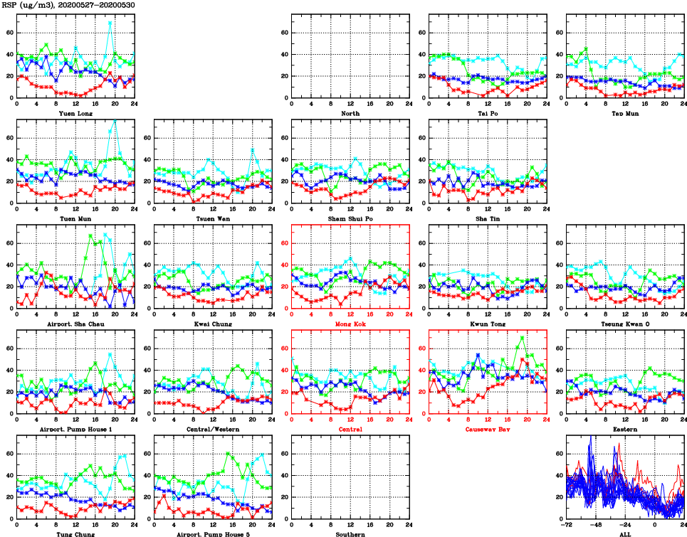 | Air Quality Data Time Series for RSP (2020/05/30) | ( Line colors: Day -3 Day -2 Day -1 Current day ) | 2D Map Current AQHI |