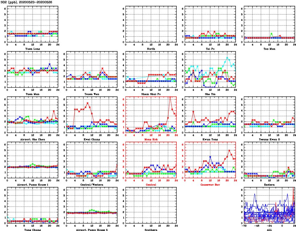| Air Quality Data Time Series for SO2 (2020/05/26) | ( Line colors: Day -3 Day -2 Day -1 Current day ) | 2D Map Current AQHI |