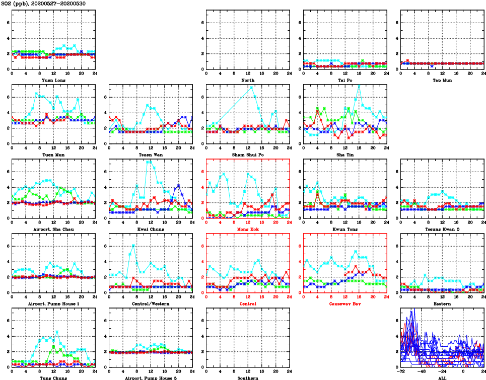 | Air Quality Data Time Series for SO2 (2020/05/30) | ( Line colors: Day -3 Day -2 Day -1 Current day ) | 2D Map Current AQHI |