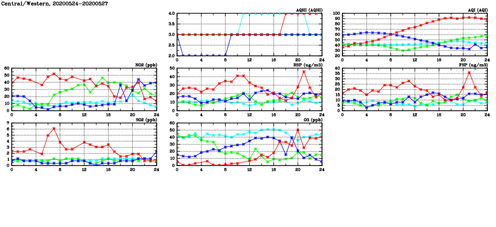 | Air Quality Data Time Series in Central/Western (2020/05/27) | ( Line colors: Day -3 Day -2 Day -1 Current day ) | 2D Map Current AQHI |