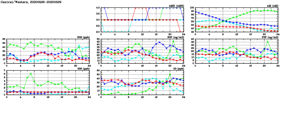 | Air Quality Data Time Series in Central/Western (2020/05/29) | ( Line colors: Day -3 Day -2 Day -1 Current day ) | 2D Map Current AQHI |