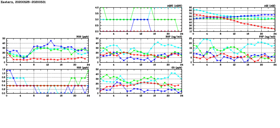 | Air Quality Data Time Series in Eastern (2020/05/31) | ( Line colors: Day -3 Day -2 Day -1 Current day ) | 2D Map Current AQHI |