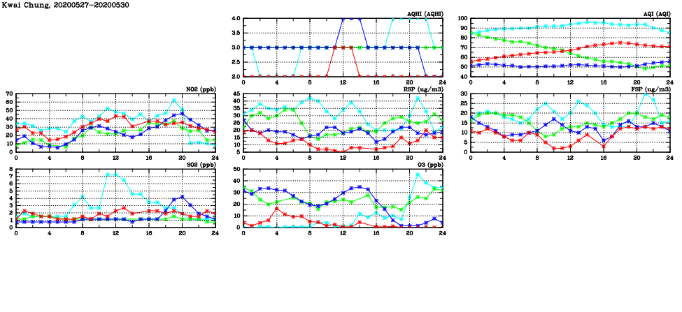 | Air Quality Data Time Series in Kwai Chung (2020/05/30) | ( Line colors: Day -3 Day -2 Day -1 Current day ) | 2D Map Current AQHI |