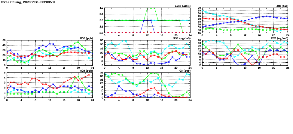 | Air Quality Data Time Series in Kwai Chung (2020/05/31) | ( Line colors: Day -3 Day -2 Day -1 Current day ) | 2D Map Current AQHI |