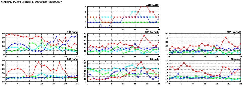 | Air Quality Data Time Series in Airport, Pump House 1 (2020/05/27) | ( Line colors: Day -3 Day -2 Day -1 Current day ) | 2D Map Current AQHI |