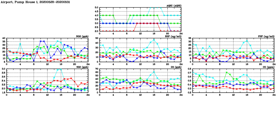 | Air Quality Data Time Series in Airport, Pump House 1 (2020/05/31) | ( Line colors: Day -3 Day -2 Day -1 Current day ) | 2D Map Current AQHI |