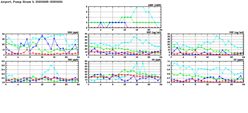 | Air Quality Data Time Series in Airport, Pump House 5 (2020/05/31) | ( Line colors: Day -3 Day -2 Day -1 Current day ) | 2D Map Current AQHI |