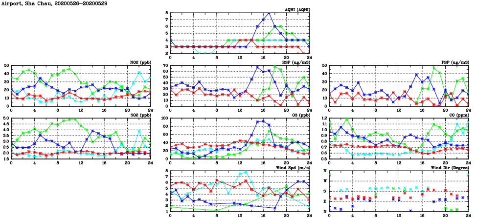 | Air Quality Data Time Series in Airport, Sha Chau (2020/05/29) | ( Line colors: Day -3 Day -2 Day -1 Current day ) | 2D Map Current AQHI |