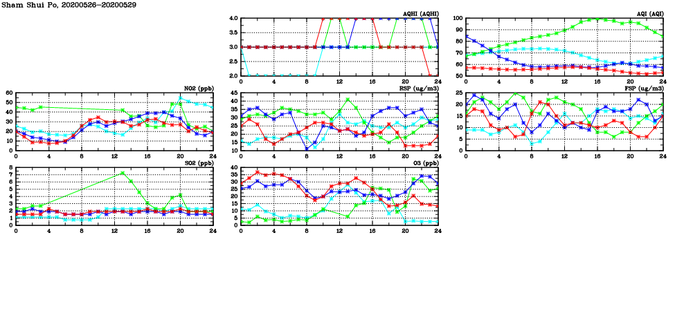 | Air Quality Data Time Series in Sham Shui Po (2020/05/29) | ( Line colors: Day -3 Day -2 Day -1 Current day ) | 2D Map Current AQHI |