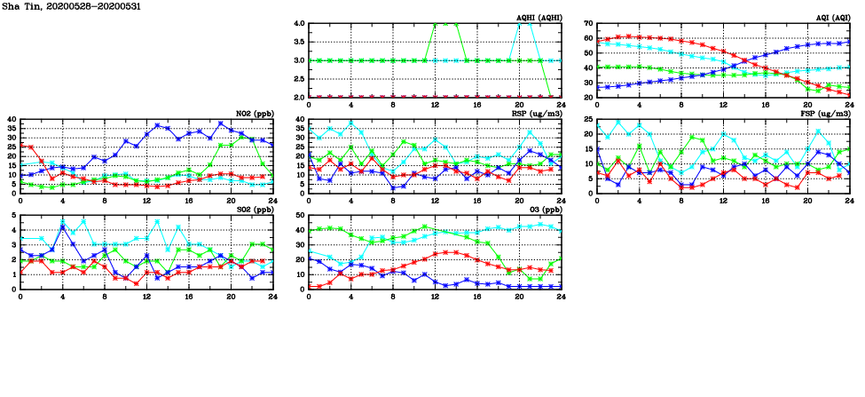 | Air Quality Data Time Series in Sha Tin (2020/05/31) | ( Line colors: Day -3 Day -2 Day -1 Current day ) | 2D Map Current AQHI |