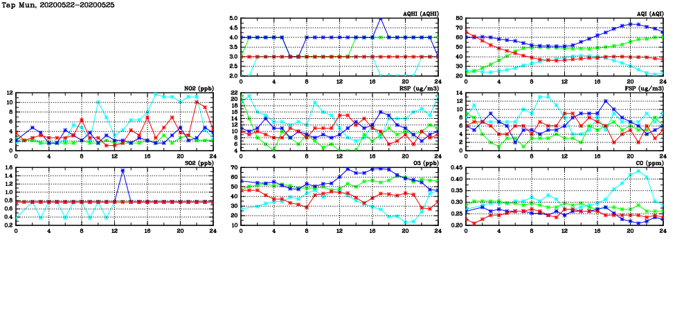 | Air Quality Data Time Series in Tap Mun (2020/05/25) | ( Line colors: Day -3 Day -2 Day -1 Current day ) | 2D Map Current AQHI |