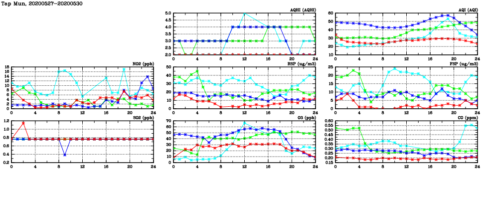 | Air Quality Data Time Series in Tap Mun (2020/05/30) | ( Line colors: Day -3 Day -2 Day -1 Current day ) | 2D Map Current AQHI |