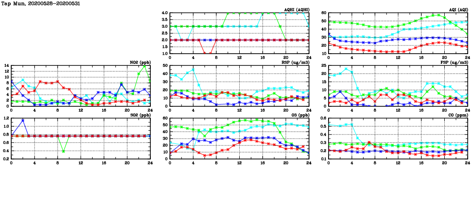 | Air Quality Data Time Series in Tap Mun (2020/05/31) | ( Line colors: Day -3 Day -2 Day -1 Current day ) | 2D Map Current AQHI |