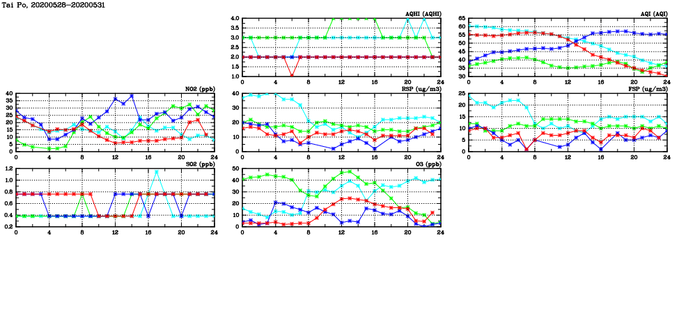| Air Quality Data Time Series in Tai Po (2020/05/31) | ( Line colors: Day -3 Day -2 Day -1 Current day ) | 2D Map Current AQHI |