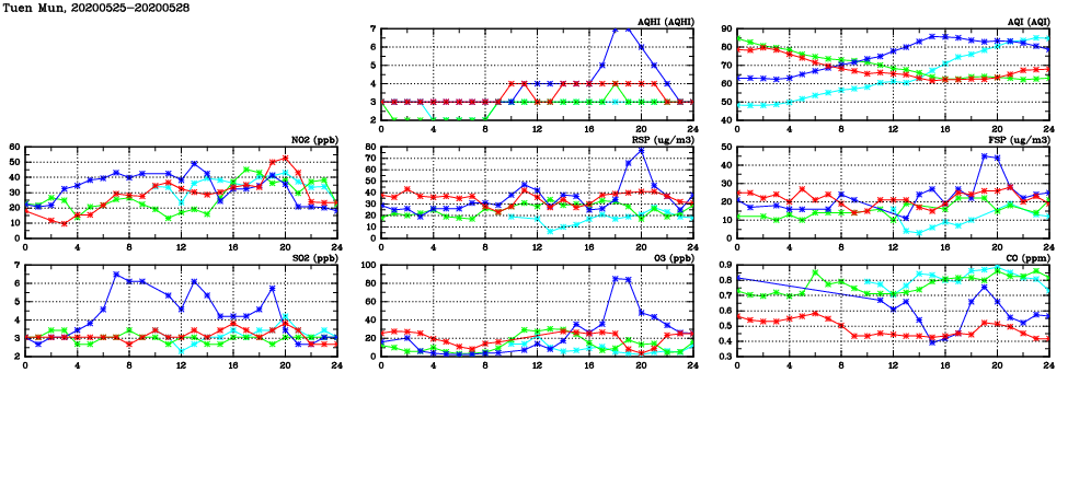 | Air Quality Data Time Series in Tuen Mun (2020/05/28) | ( Line colors: Day -3 Day -2 Day -1 Current day ) | 2D Map Current AQHI |
