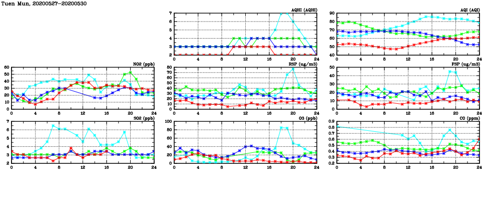 | Air Quality Data Time Series in Tuen Mun (2020/05/30) | ( Line colors: Day -3 Day -2 Day -1 Current day ) | 2D Map Current AQHI |