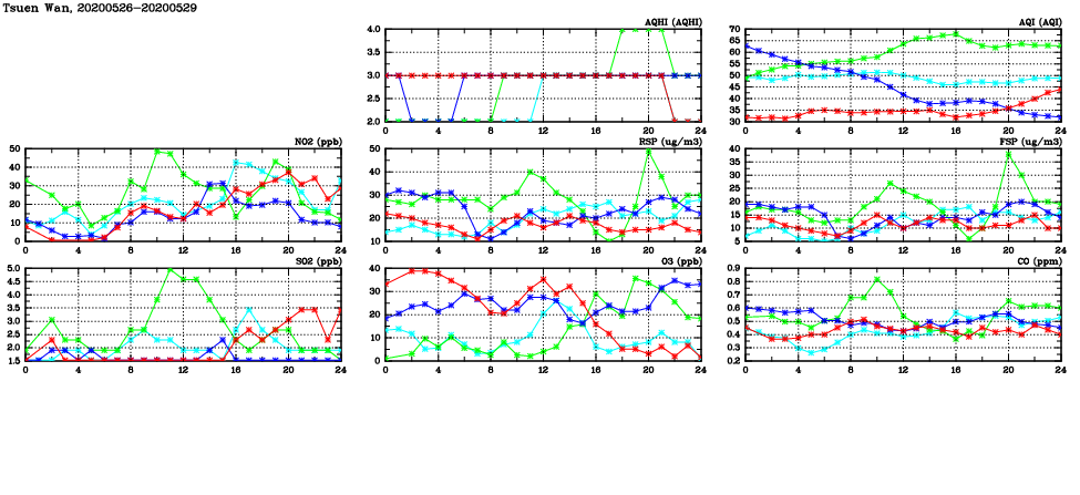 | Air Quality Data Time Series in Tsuen Wan (2020/05/29) | ( Line colors: Day -3 Day -2 Day -1 Current day ) | 2D Map Current AQHI |