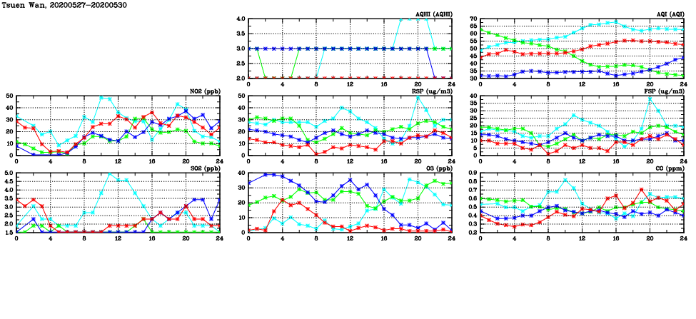| Air Quality Data Time Series in Tsuen Wan (2020/05/30) | ( Line colors: Day -3 Day -2 Day -1 Current day ) | 2D Map Current AQHI |