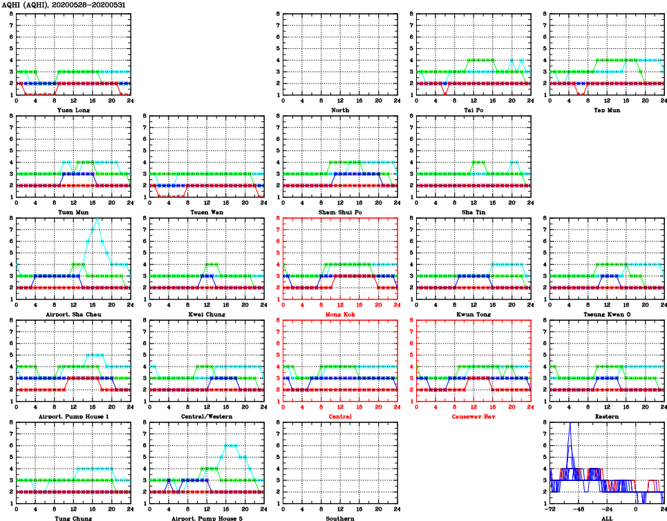 | Air Quality Data Time Series for AQHI (2020/05/31) | ( Line colors: Day -3 Day -2 Day -1 Current day ) | 2D Map Current AQHI |