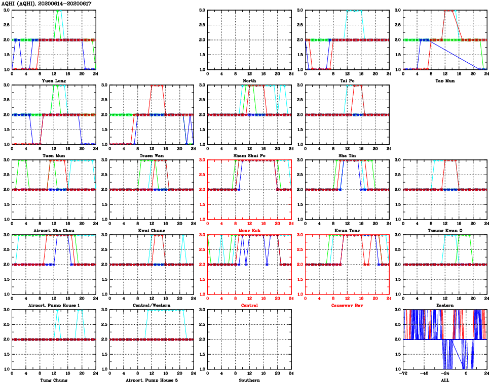 | Air Quality Data Time Series for AQHI (2020/06/17) | ( Line colors: Day -3 Day -2 Day -1 Current day ) | 2D Map Current AQHI |