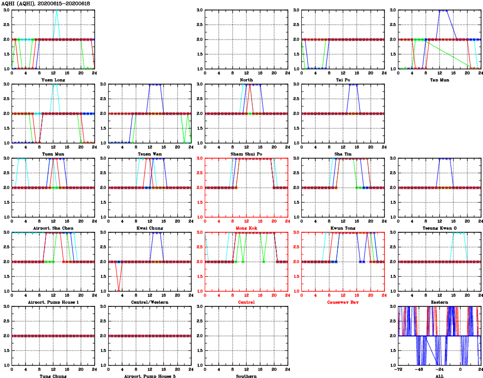| Air Quality Data Time Series for AQHI (2020/06/18) | ( Line colors: Day -3 Day -2 Day -1 Current day ) | 2D Map Current AQHI |